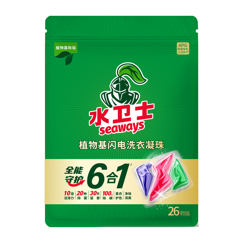全效守护6合一,APG天然洁净因子,10倍洁净力,20种除菌,30天留香,100%除螨率,柔衣护色,净味消臭,一次一粒搞定所有清洗衣物。